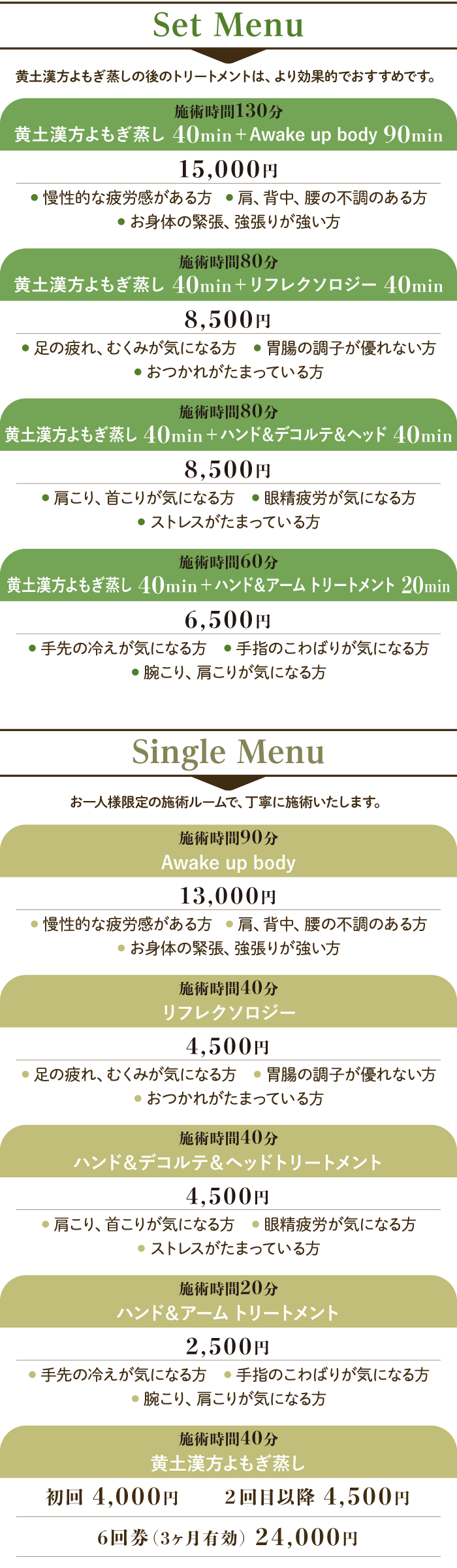 施術時間にはカウンセリング・お着替えなどの時間は含まれておりません。